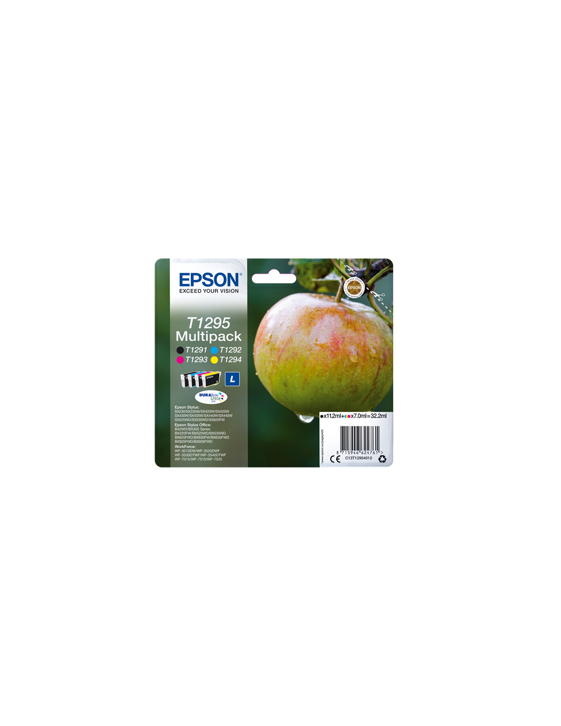 La Cartouche d'encre Epson référence C13T12954012 de couleur 4 cartouches d'encre:T1291 + T1292 + T1293 + T1294, est donnée par le constructeur pour une capacité de . Cette cartouche est compatible avec les imprimantes Epson Stylus Office BX305F, Stylus Office BX320FW, Stylus Office B42WD, Stylus SX420W, Stylus SX425W, Stylus SX425W, Stylus SX525WD, Stylus SX620FW, Stylus Office BX305FW, Stylus Office BX525WD, Stylus Office BX625FWD, Stylus Office BX925FWD, Stylus Office BX620FWD, Stylus Office BX535WD, Stylus SX440W, Stylus SX445W, Stylus Office BX635FWD,