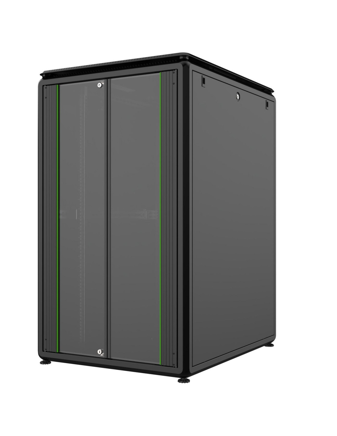 Les cabinets présentent une résistance maximale grâce aux supports latéraux et à des points de support en omega cubique. Les panneaux latéraux, facilement amovibles, disposent d'un système de verrouillage à barillet. Les cabinets de hauteurs 42U et 46U sont dotés de panneaux latéraux à séparation verticale, simplifiant ainsi leur démontage lors de l'installation ou de l'entretien, même dans des espaces réduits.