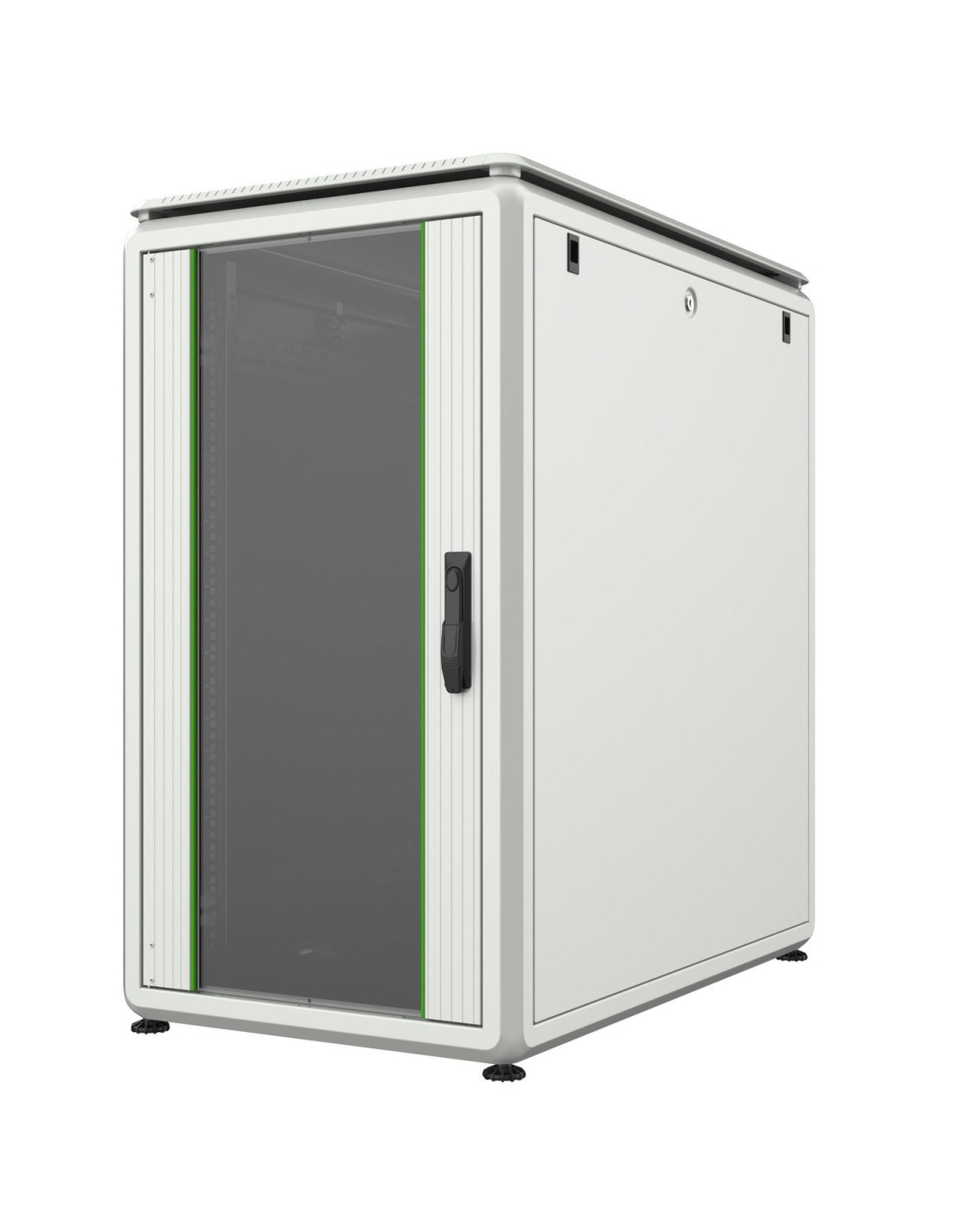 Avec une robustesse maximale permise par les supports latéraux et les points de soutien en cube omega, l'accès à l'intérieur du cabinet est facilité. De plus, les panneaux latéraux sont amovibles et sécurisés par un système de verrouillage à barillet, ce qui est particulièrement avantageux pour les modèles de haute capacité tels que les 42U et 46U.