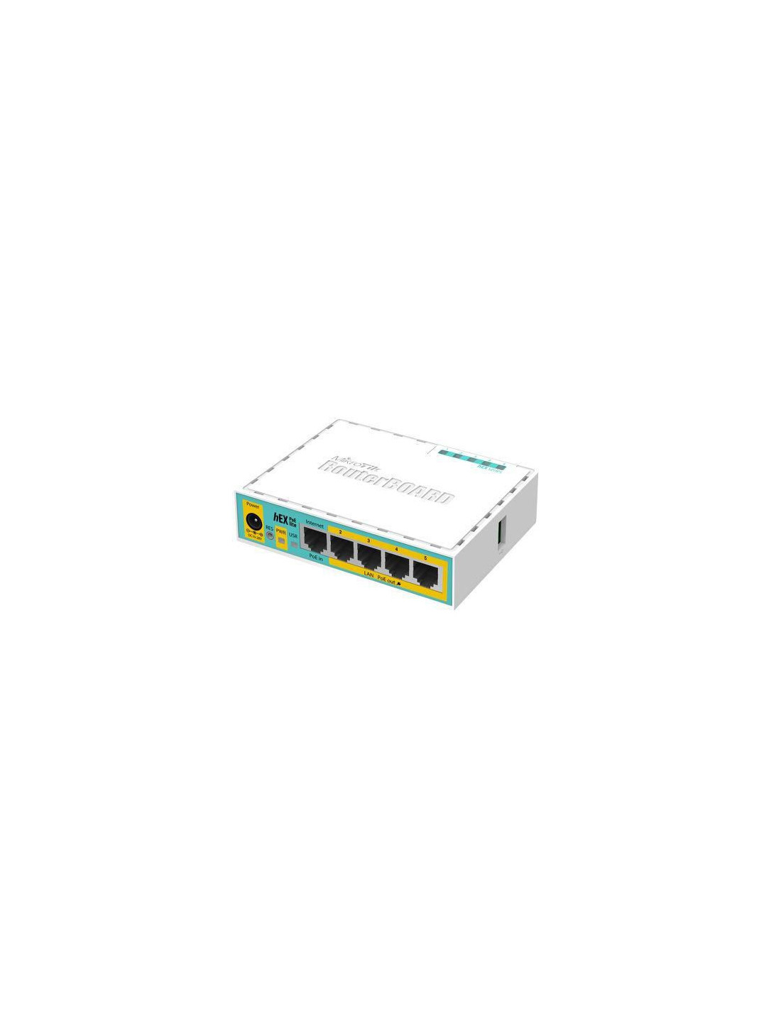Le MikroTik RouterBOARD hEX PoE lite est un petit routeur Ethernet à cinq ports dans un boîtier en plastique. Il dispose d'un port USB 2.0 et d'une sortie PoE. Les ports 2 à 5 peuvent alimenter d'autres appareils compatibles PoE avec la même tension que celle appliquée à l'unité. Moins d'adaptateurs et de câbles d'alimentation à gérer ! Le courant maximal est de 1A par port, les ports Ethernet sont blindés.
